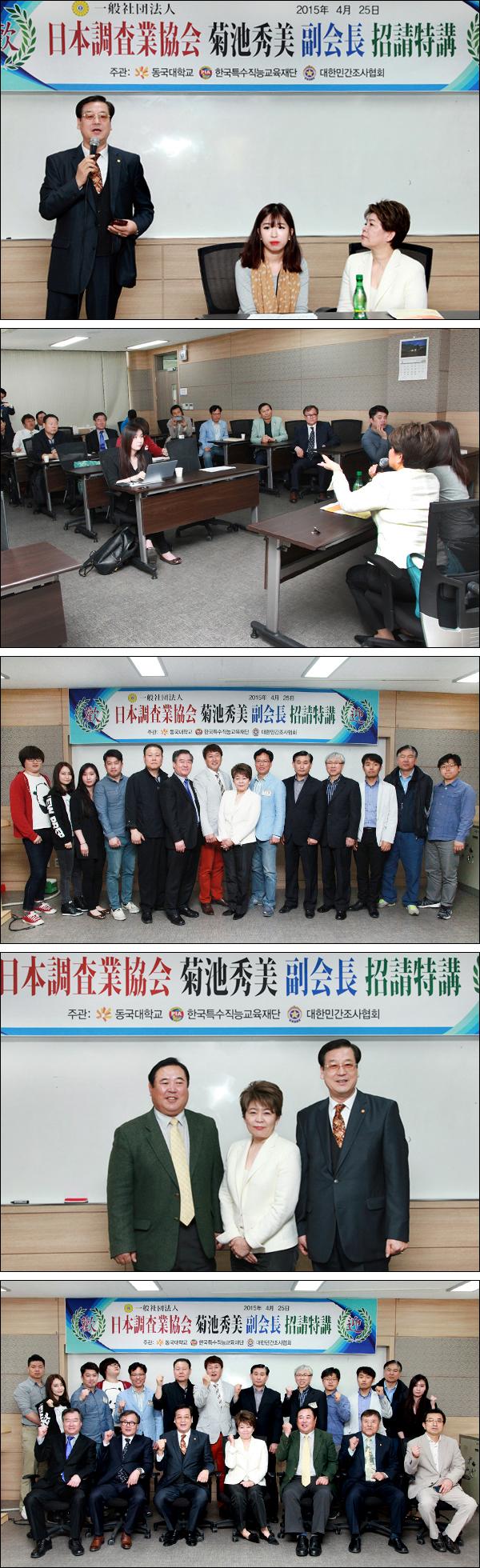 2015년 4월 25일 동국대학교 PIA 민간조사(탐정) 54기 최고위과정의 일환으로 일반사단법인 일본조사업협회 기구치 히데미 부회장을 모시고 일본 민간조사 제도와 향후 한일 민간조사업 교류에 대한 특강을 마련했습니다.