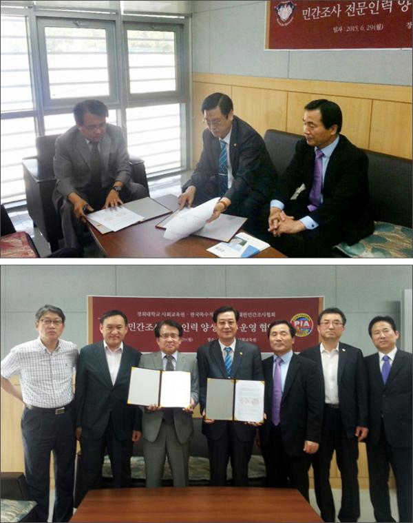한국특수직능교육재단/대한민간조사협회 하금석 회장과 경희대학교 사회교육원 김학민 원장은 2015년 6월 29일 경희대학교에서 민간조사(탐정) 최고위과정, PIA민간조사 자격취득 전문화 교육에 관한 업무제휴 협약식을 거행하였습니다.