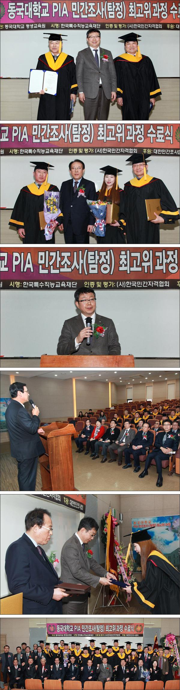 2016년 3월 11일(금요일) 서울 동국대학교 문화관 학명세미나실에서 관련기관 단체장은 물론, 정·재계, 학계, 지도교수 등이 참석한 가운데 동국대학교 PIA 민간조사(탐정) 제58기 최고위과정 수료식이 거행되었습니다.