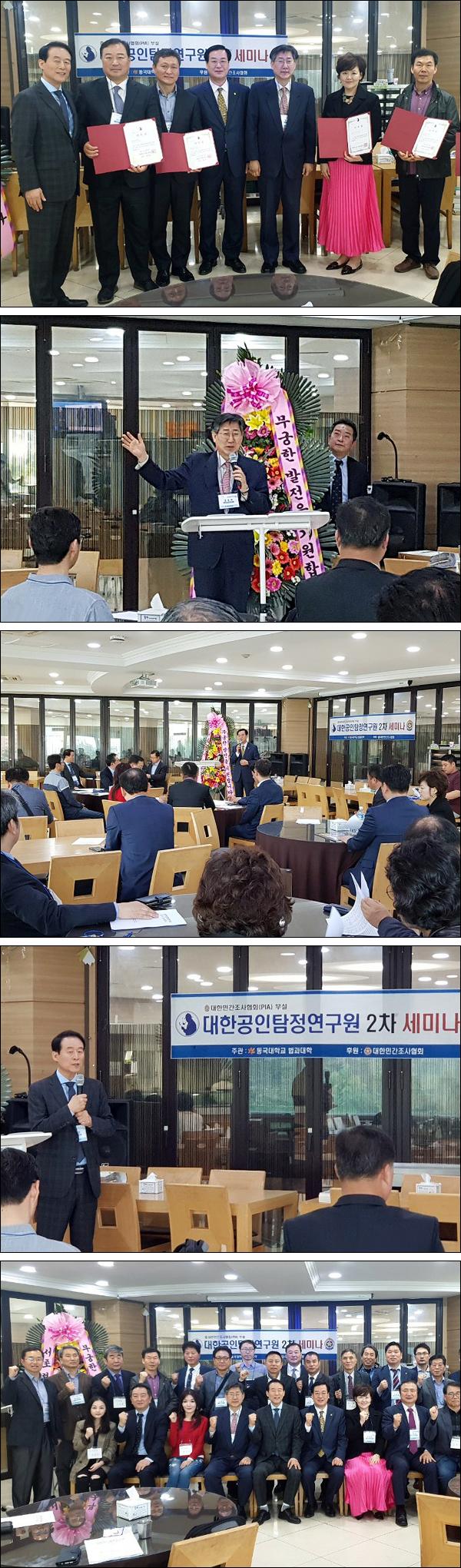 지난 4월 30일 동국대학교 상록원 3층 연회장에서 공인탐정 제도 입법추진을 위한 대한민간조사협회 부설 대한공인탐정연구원 2019년 제2차 정기모임 학술세미나가 동국대학교 법무대학원, 한국특수직능교육재단/대한민간조사협회의 임원 및 지도교수, 관련기관 단체장 등이 참석한 가운데 동국대법무대학원 윤현종 교수 사회로 성황리에 개최되었습니다.