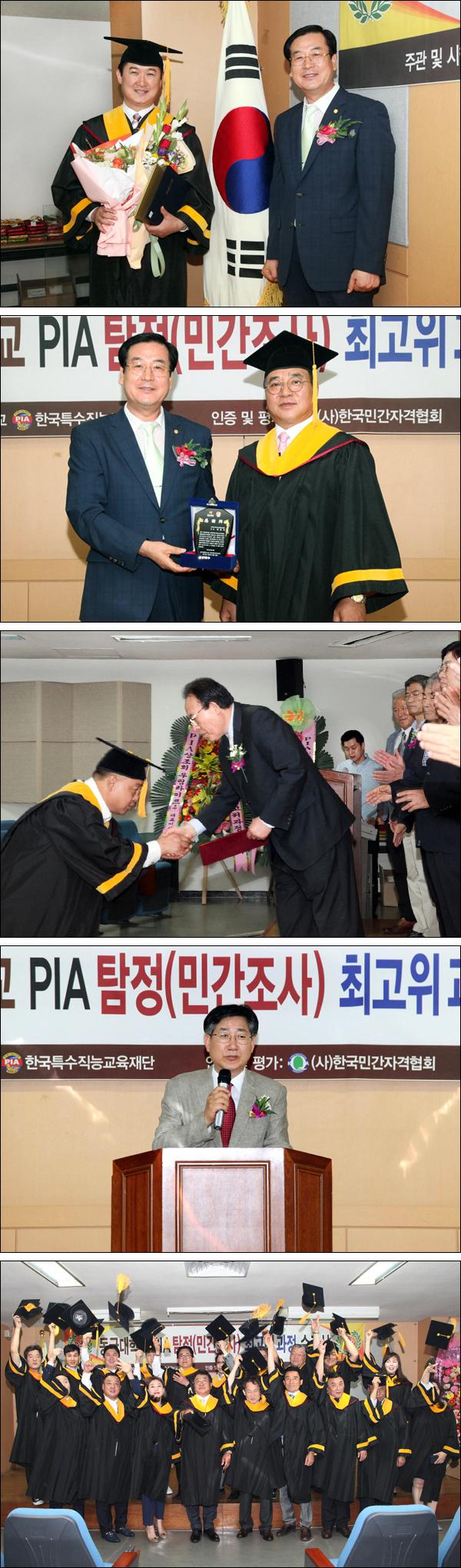 이날 수료식에는 동국대학교 평생교육원 박선형 원장, 한국특수직능교육재단 정학균 총장, 대한민간조사협회 하금석 회장, PIA 총동문회 남현우 회장 등이 참석하여 수료식 행사를 진행하였으며 아울러 내·외빈 및 지도교수, 교육생 등 50여명이 참석하여 PIA 최고위과정에 대한 높은 관심을 보여주었으며, 수료식 행사를 마치고 수료생들과 석별의 정을 나누며 앞으로 PIA 회원으로서 친목도모와 상호 정보 교류는 물론 협회 발전에 최선 다하기로 다짐하였습니다.