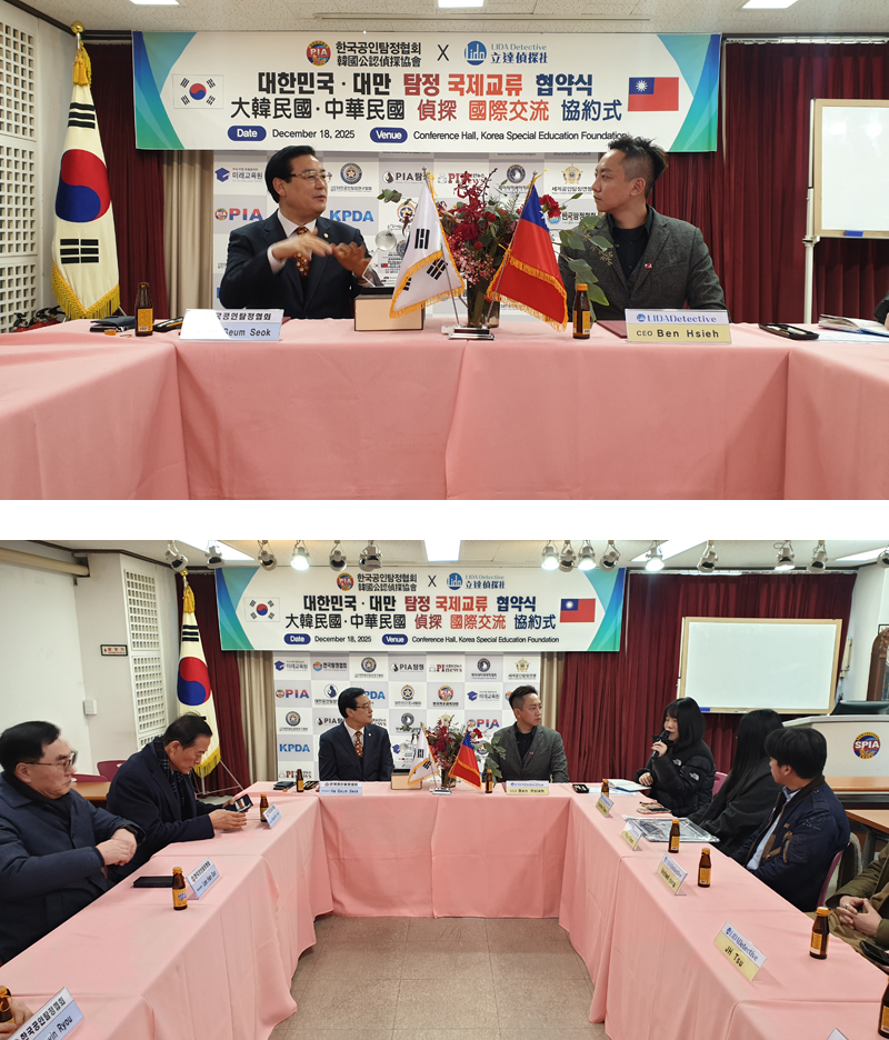 2025년 12월 18일 한국공인탐정협회·아시아공인탐정연맹(AFCD), 대만을 대표하는 민간조사 전문기관인 리다탐정사무소(Lida International Detective Agency)와 국제 협력 강화를 위한 업무협약(MOU)을 체결 |